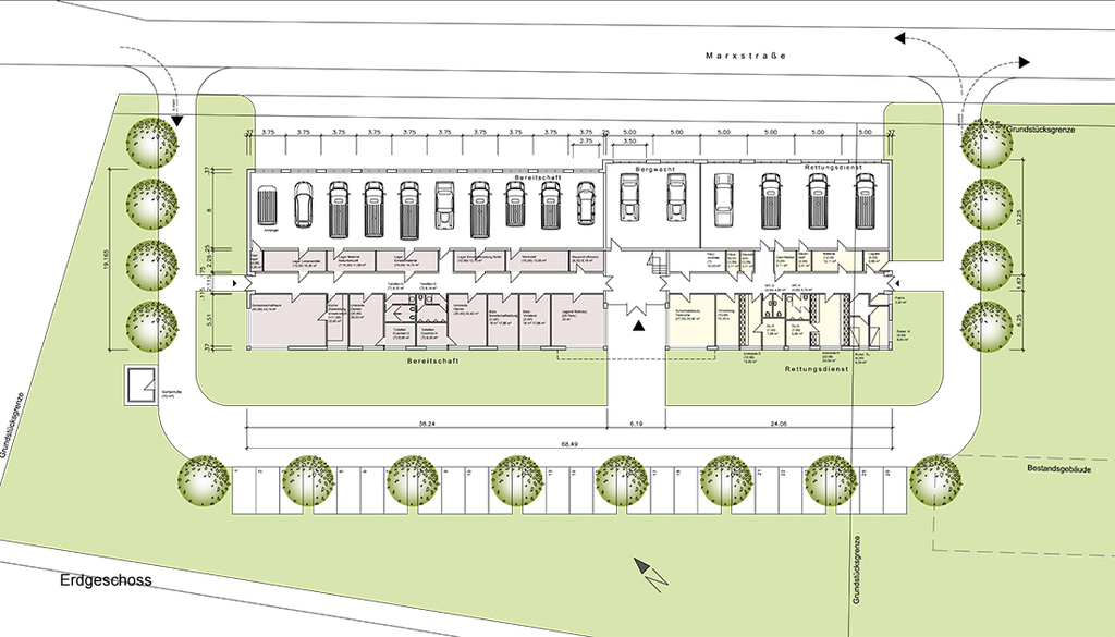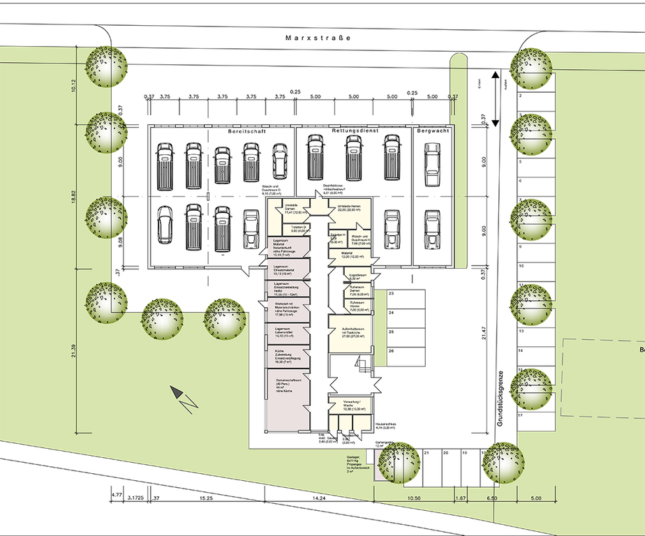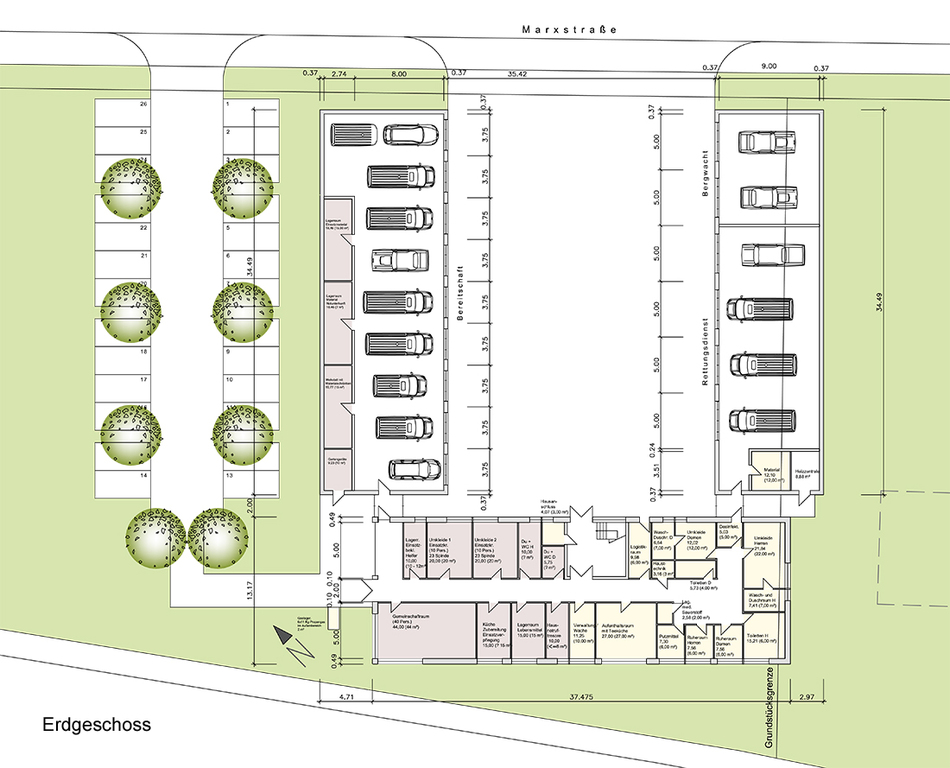 EG: 15 Fahrzeuge für Rettungsdienst, Bereitschaft und Bergwacht, Lagerräume, Küche, Gemeinschaftsräume, Logistik etc.
